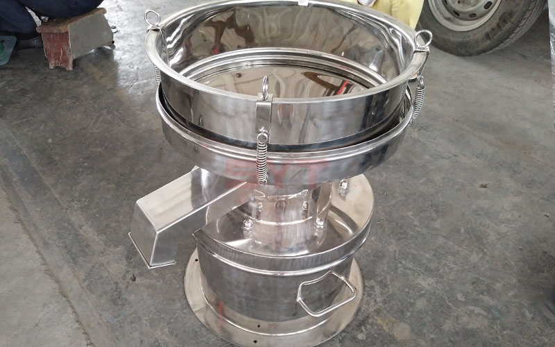 450型過濾篩是采用新型立式振動電機為振動源,立式振動電機上、下端裝有偏心重錘, 可產生水平、垂直、傾斜的三次元運動,激振力通過接料盤傳遞到篩框及物料上以達到優良分級。通過調節上、下偏心重錘的相位角,可改變物料在篩麵上的運動軌跡,保證物料充分分級。